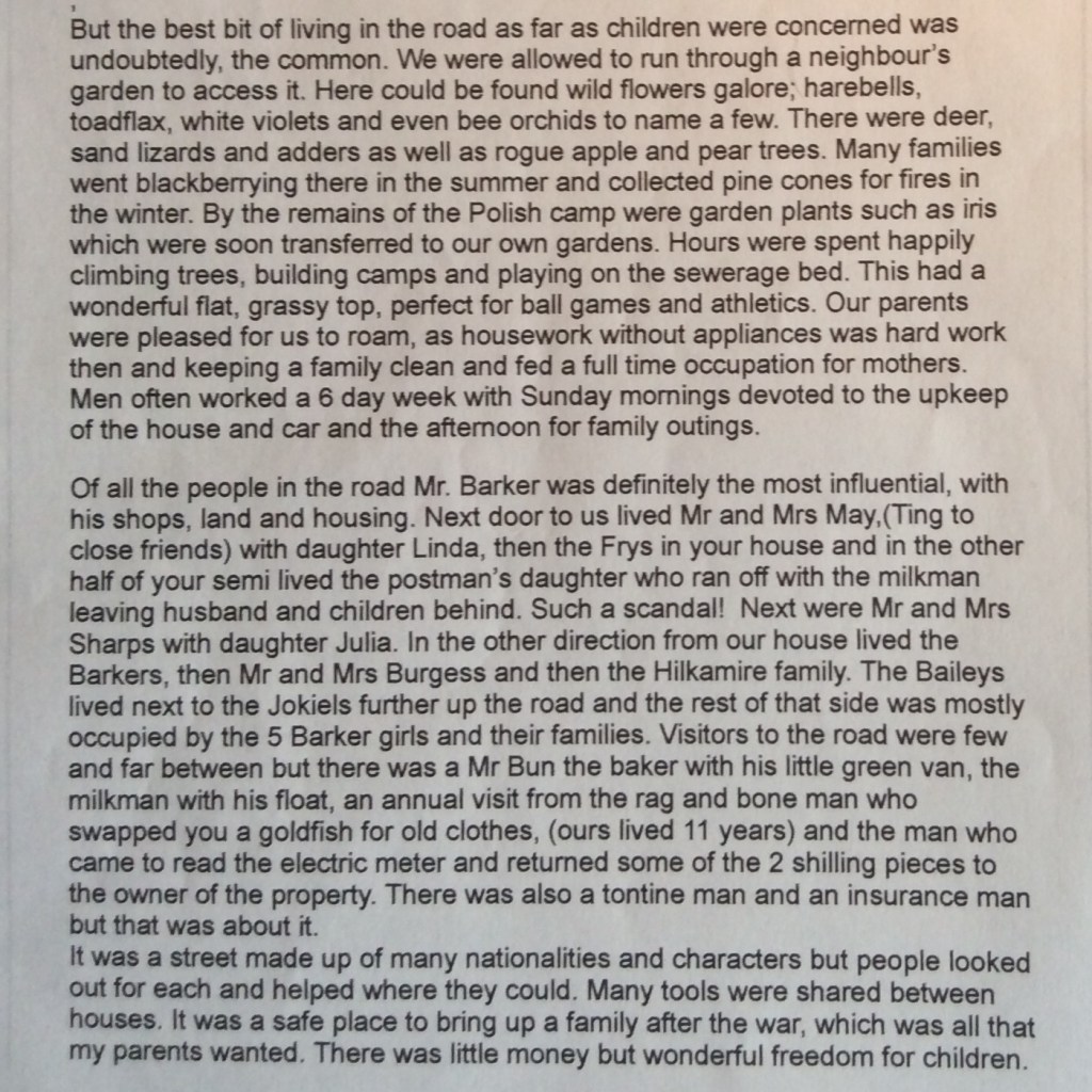 The road was all bumpy and sandy with potholes and puddles and a few dogs used to roam around. Everything was friendly and we all knew each other. We used to play round the green thing ….as we called it…a big green box on the corner of the road with electrics or something inside and play hopscotch or go over the Common behind the houses to play we all went together.