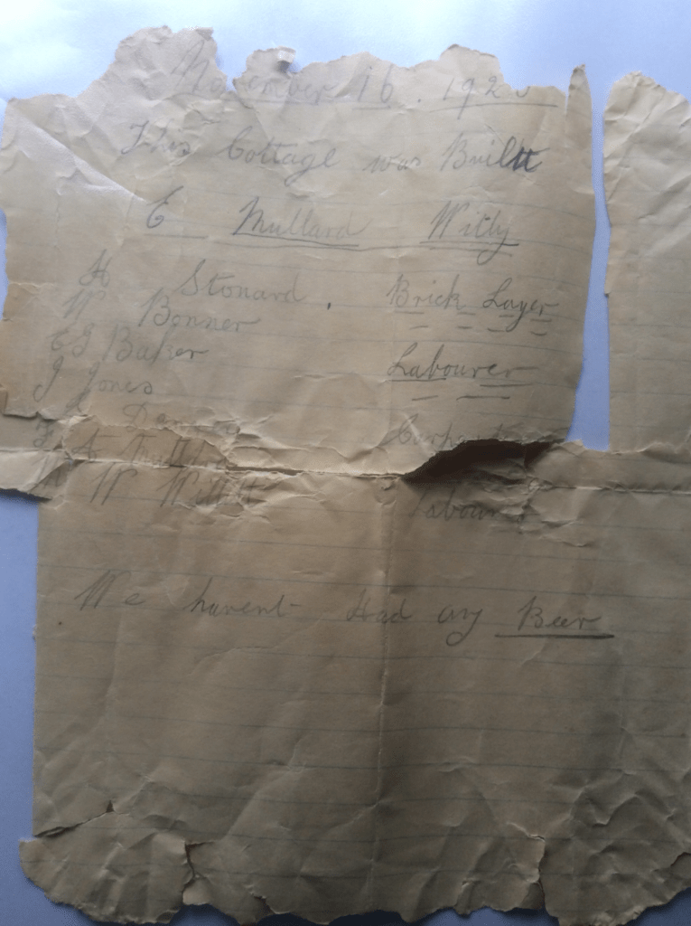 Mary Rowe found this note under the floorboards showing when the property was completed by the workmen who obviously felt that Mrs. Mullard had not given them their full reward.